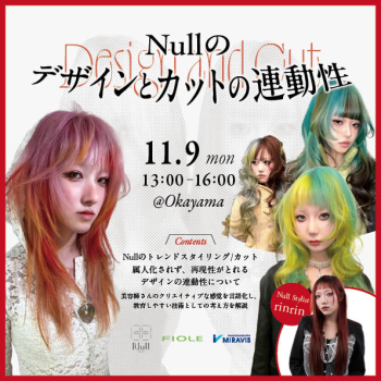 | 内 容 | Nullのトレンドスタイリング/カット 属人化されず、再現性がとれるデザインの 連動性について 美容師さんのクリエイティブな感覚を言語化し、教育しやすい技術としての考え方を解説。 |