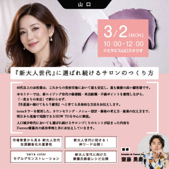 40代以上のお客様は、これからの美容市場において最も安定し、最も価値の高い顧客層です。本セミナーでは、新エイジング世代の価値観・来店動機・不満ポイントを整理しながら、「一度きりの来店」で終わらせず、『生涯通い続けてもらう顧客』へと育てる具体的な方法をお伝えします。terraカラーを使用した、カウンセリング・メニュー設計・価格の考え方・提案の伝え方まで、 明日から現場で実践できるHOW TOを中心に解説。人口減少時代においても選ばれ続けるサロンづくりのヒントが詰まった内容を Forever齋藤氏の成功事例と共にお伝えしていきます。