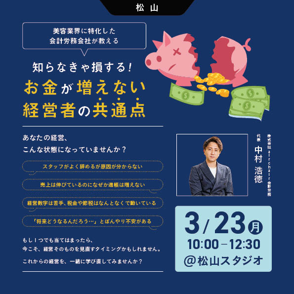 美容業界に特化した会計労務会社が教える知らなきゃ損する!お金が増えない経営者の共通点。今こそ、経営そのものを見直すタイミングかもしれません。これからの経営を、一緒に学び直してみませんか?