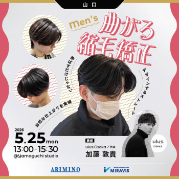 | 内容 | 脱・ピンピンストレート!曲がる縮毛矯正とは何なのか?悩めるクセ毛男子を変身させる、その方法とノウハウを大公開!美容師歴1年9ヶ月でulus Osakaを立ち上げたナニワの規格外ルーキー加藤氏の技術・ブランディング力が覗けるセミナー、是非ご参加下さい。 |